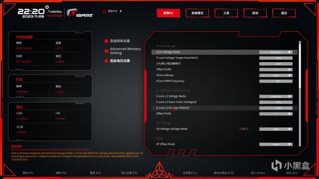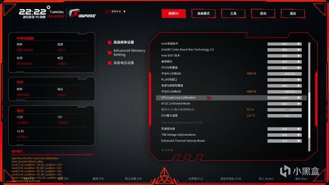 CPU 超频设置,防掉压设置有5个级别,详细的设置信息在左下角。