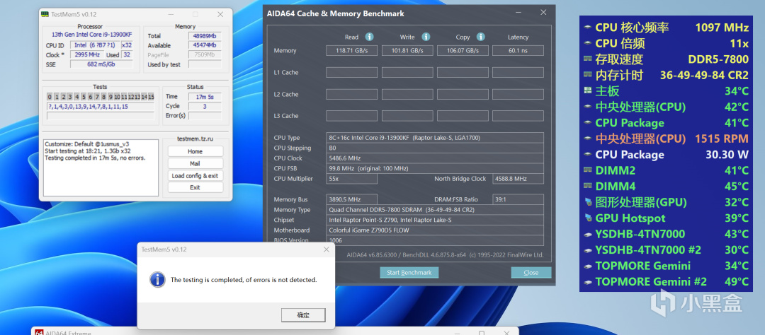 我先做个简单总结,内存超频实测基本盘是7800 7600频率,C34/C36时序。