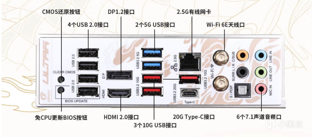 接口方面也毫不吝啬,1个PCIe 5.0x16插槽,4个M.2 PCIe 4.0接口,1个20G的USB-C 接口且支持 30W PD充电,6个SATA接口
