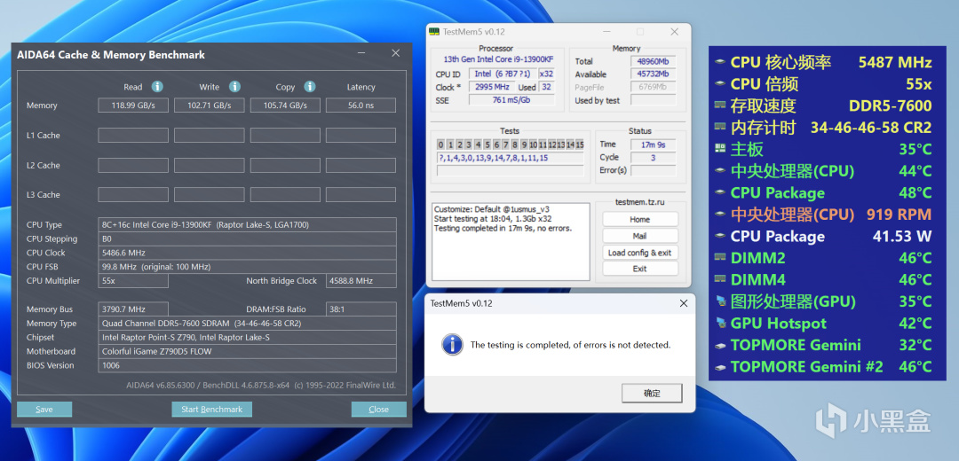 轻松点亮,跑AIDA64测试,但是由于我这颗CPU IMC体质不行,无法通过内存烧鸡测试。