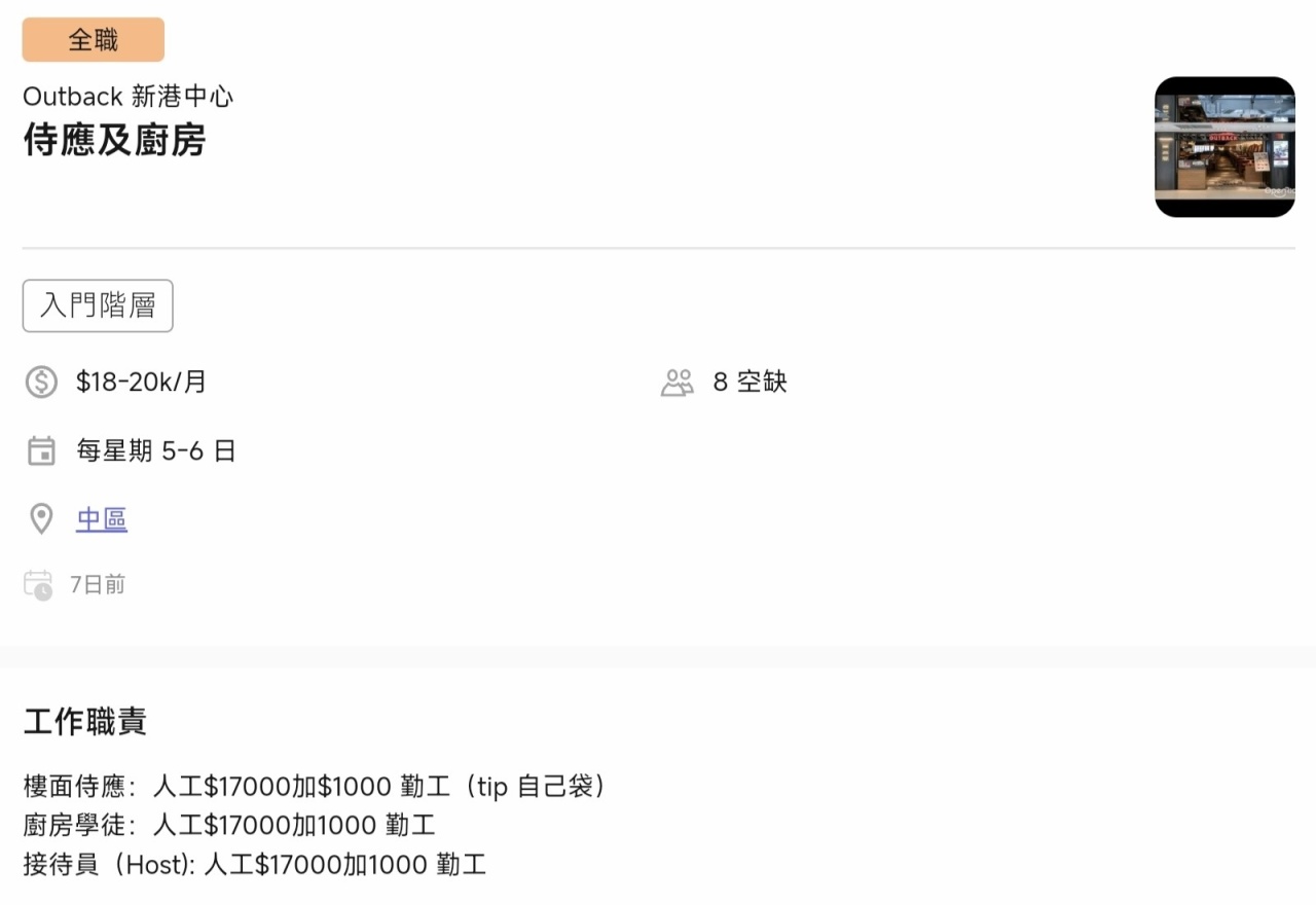 不过好事是,这么低的工资在香港大抵是完全招不到人的,所以我在香港的招聘网站上找了一些基础劳动工作者的全职工资供大家参考,以下: