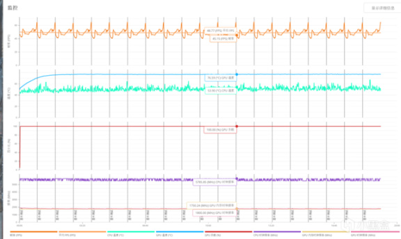 GPU核心頻率1530MHz,溫度最高76.1度。