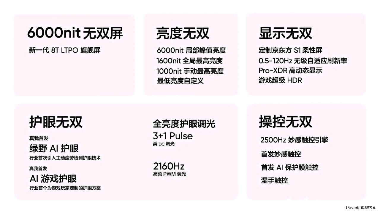 ◆ 屏幕:1.5K OLED屏,支持8TLTPO自适应高刷,1000nit手动最高亮度/1600nit全局最高亮度/6000nit峰值亮度,2160HzPWM 高频调光,2500Hz瞬时操控;