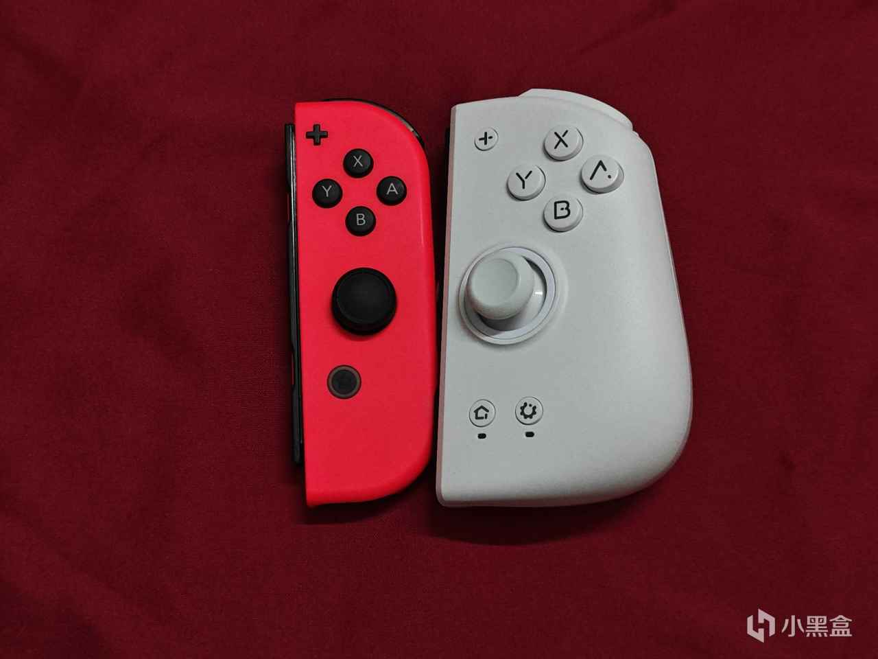 有些人好奇双子星2代的手柄要比joy-con大多少,我这边给大家一张对比图,,能看到双子星2代总体要比joy-con大上一圈。,但是键位设计也因此不会那么紧促,甚至摇杆都用上了与普通摇杆一样的大摇杆。这些提升都是实打实的,用着确实要比原装的手柄舒服不少。