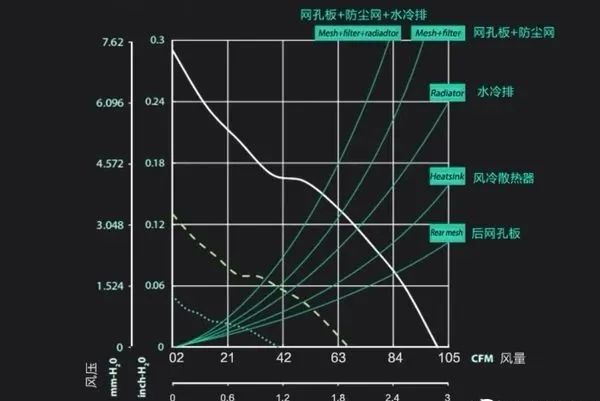根據追風者公佈的阻力曲線,機箱內的進風網孔板與防塵網,有着比水冷排、風冷散熱器更大的阻力系數,這是意料之外,也是情理之中的結果。