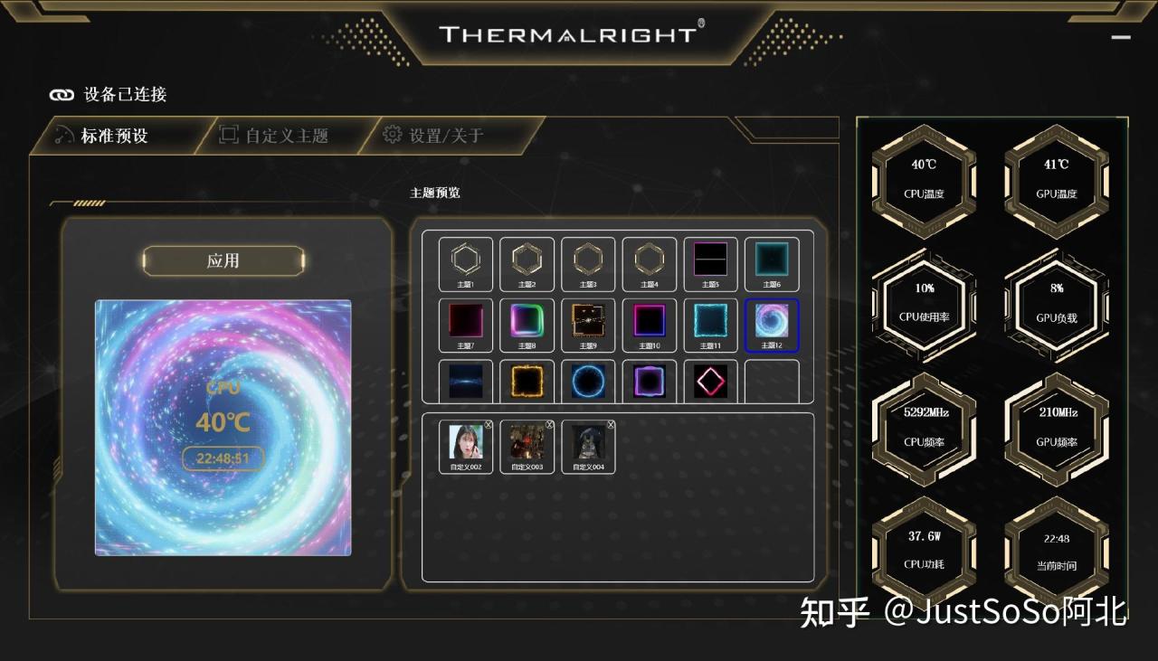 ▼利民冰封視界水冷有專門的控制軟件,原生內置有18套主題,可以顯示CPU、GPU的溫度、使用率/負載、頻率以及功耗等信息。