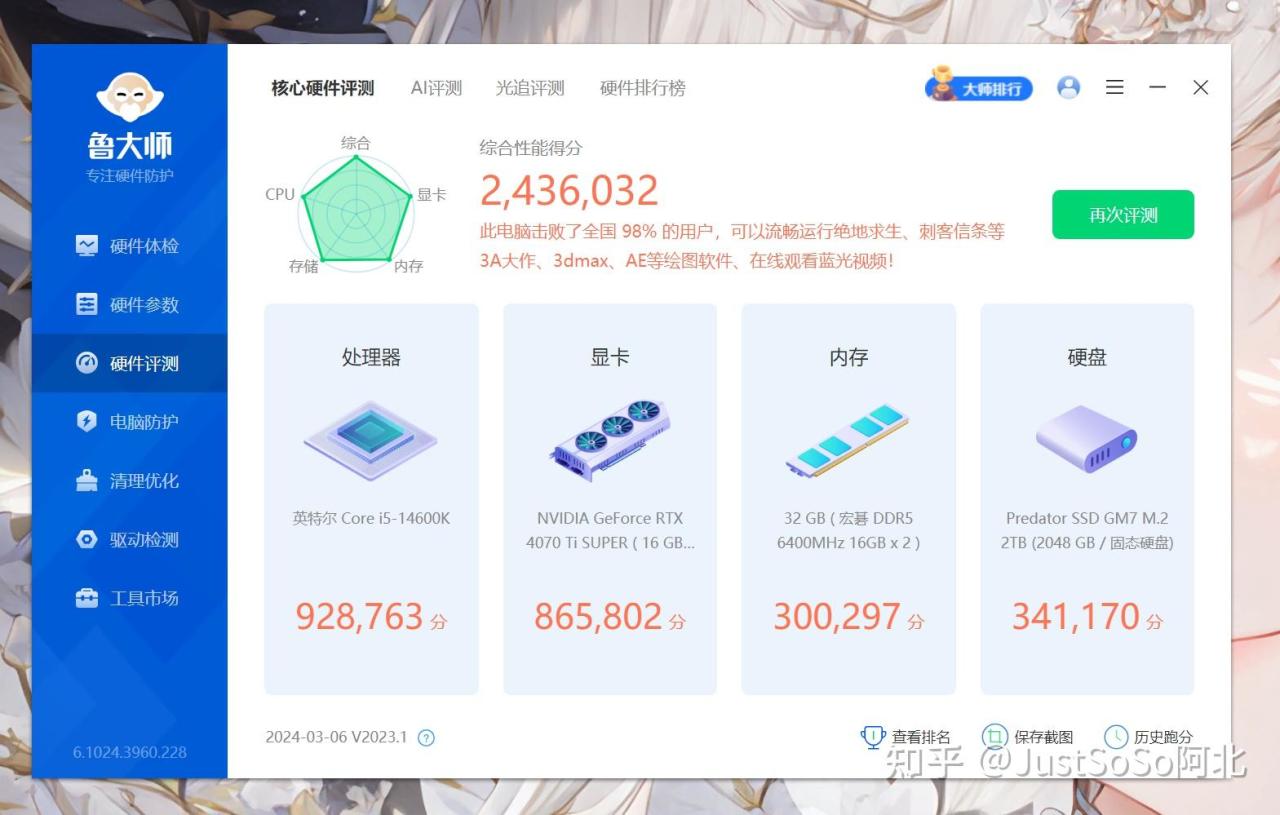 ▼先用魯大師來跑一個整體分數,243.6萬分,擊敗全國99%的用戶,從魯大師的測試結果來看,14600K的性能是13490F的1.31倍,RTX 4070 Ti Super的性能是RTX 4070的1.32倍。