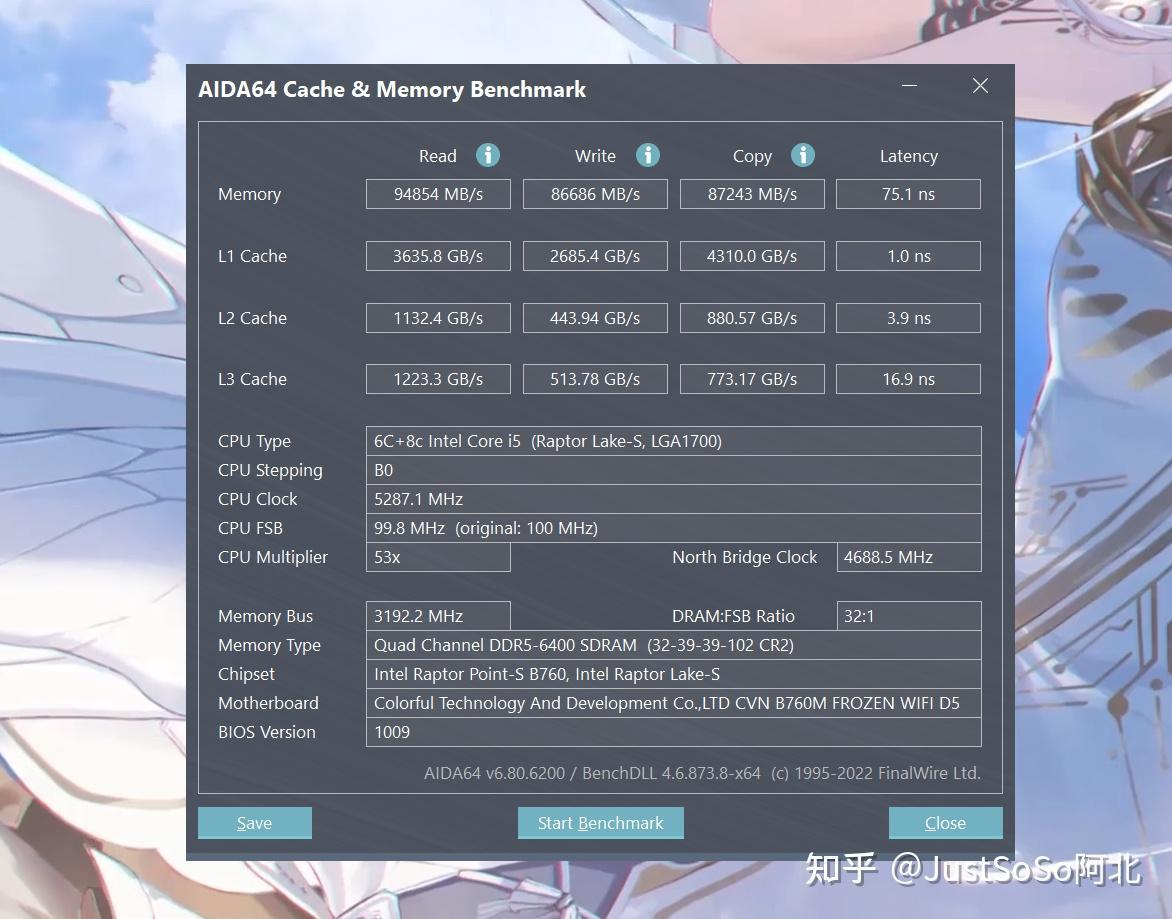 ▼通過AIDA64進行測試,可以看到宏碁掠奪者冰刃DDR5 6400 XMP到6400MHz之後,讀取速度能夠達到94854MB/s,寫入速度爲86686MB/s,複製速度爲87243MB/s,延遲75.1ns,時序爲32-39-39-102CR2,擁有絕佳的讀寫性能,甚至和我之前一堆7200MHz內存都能打的有來有回。