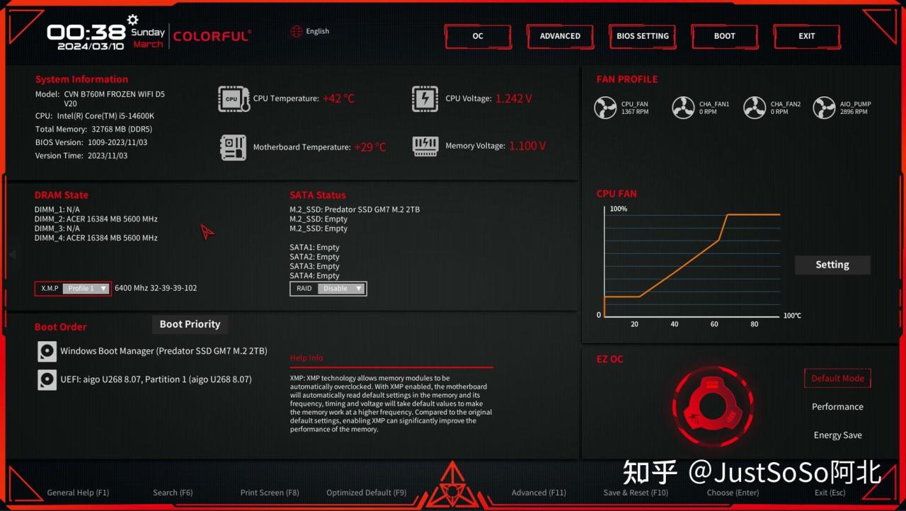 ▼七彩虹的BIOS講道理個人認爲已經很不錯了,圖形化界面直觀易用,XMP簡單灑灑水,BIOS升級也很簡單,再調個104微碼美滋滋。