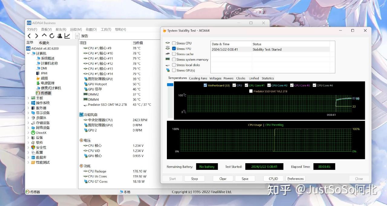 ▼使用AIDA64進行單烤FPU測試,烤機4分鐘,14600K滿載運行下,電壓1.234V,功耗178.1W,CPU最高溫度能夠達到83℃左右,在進行簡單文字處理、瀏覽網頁時CPU工作溫度38℃左右,注意,這個測試數據是我240水冷改成了“120水冷”(240冷排+單12CM風扇)的情況下,利民冰封視界240水冷實際的表現會比這個好很多。