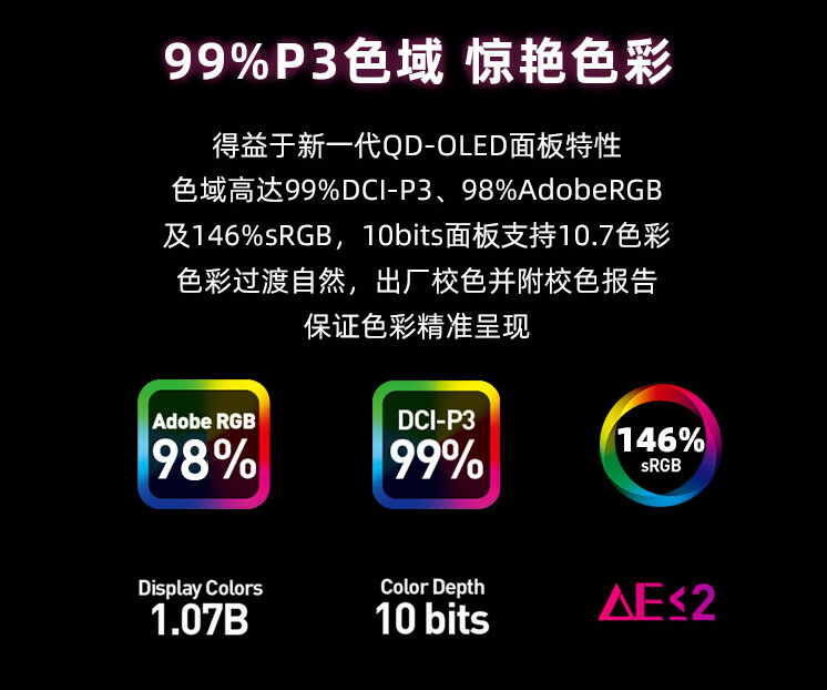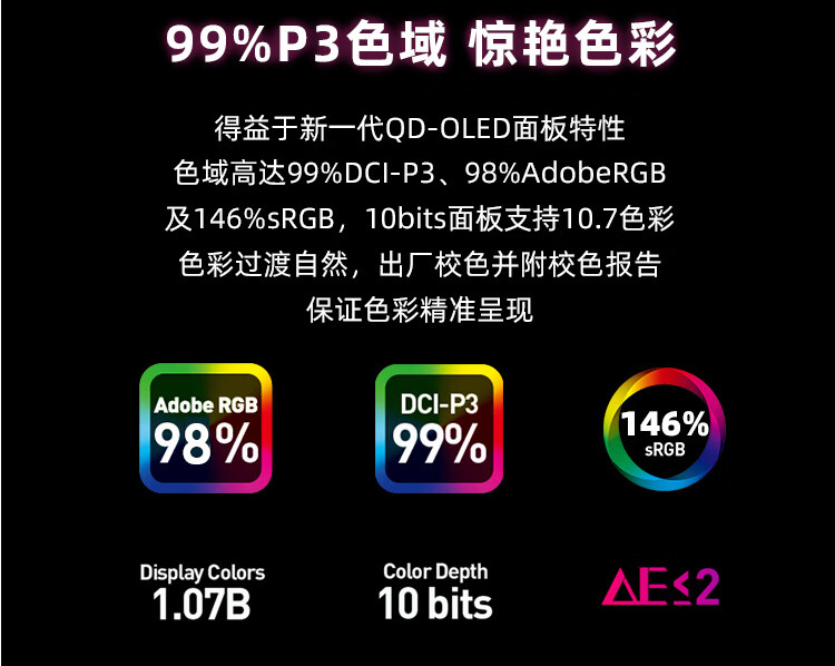▲QD-OLED在色彩方面有着天生的優勢,官方標稱其擁有99% DCI-P3與98% AdobeRGB的色域覆蓋。