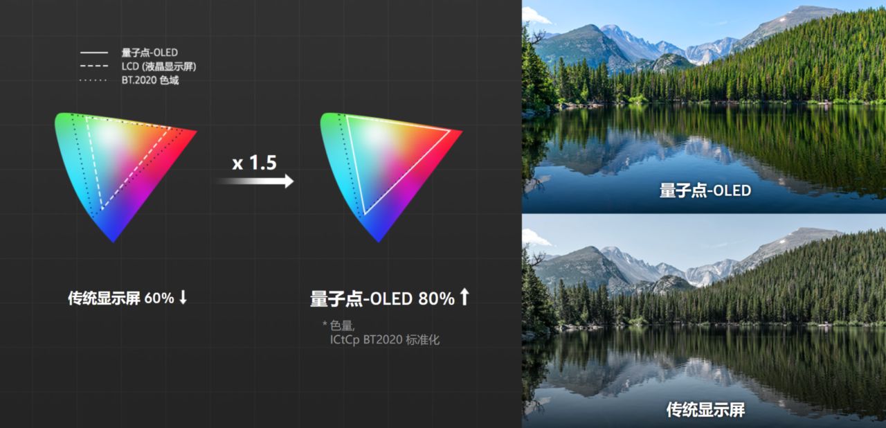 ▲得益於量子點技術與OLED技術的強強聯合,量子點OLED相較於傳統的LCD液晶顯示屏有更強的色域覆蓋,更高的對比度;而相較於普通OLED屏幕則不僅保留了其色彩好,黑色純淨的優點之外,還擁有着更高的亮度、更絢麗的色彩表現及更爲優秀的可視角度,顯示HDR畫面時更加真實。