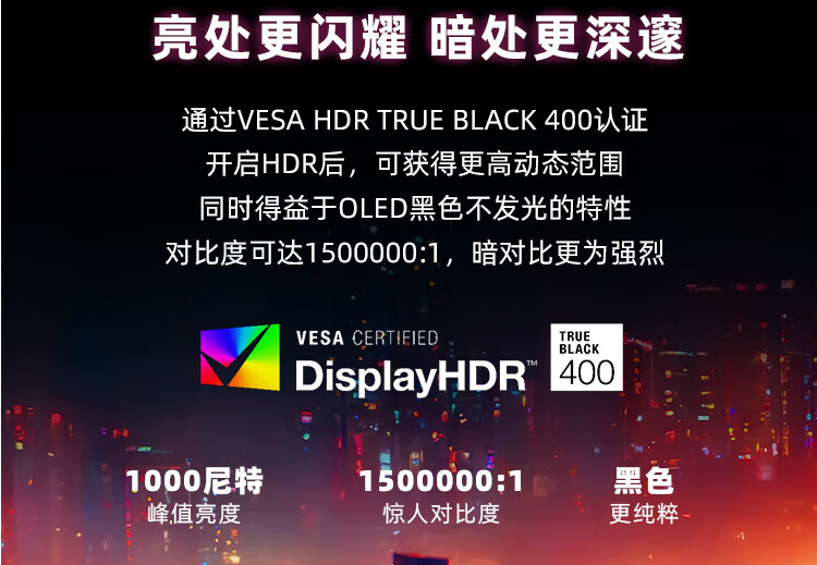 ▲首先是OLED技術,它可以獨立控制每一個像素點是否發光,所以有多少個像素點,就有多少個控光分區,所以完全不用擔心漏光的情況發生。不過,OLED顯示器的峯值亮度,目前僅能夠達到1000nit左右,因此,VESA認證面對OLED顯示設備,最高也僅提供了DisplayHDR TRUE BLACK 600認證,顯示黑色背景的場景時,OLED顯示器會顯得更加純粹。