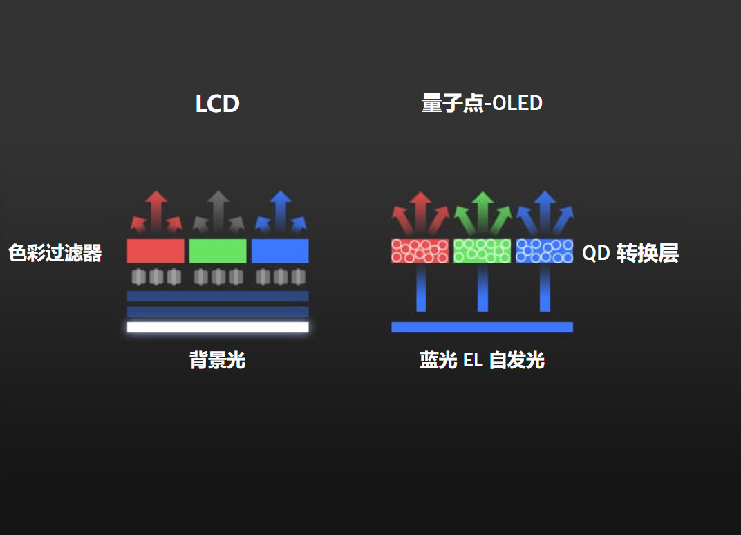 ▲簡單來說,QD-OLED(量子點-OLED)也是OLED的一種,其由可以發出高強度光線的藍光EL自發光層與量子點QD轉換層組成,QD轉換層會將藍光EL發光層的光源按照畫面內容全部轉換爲紅綠藍三原色而基本無損耗。