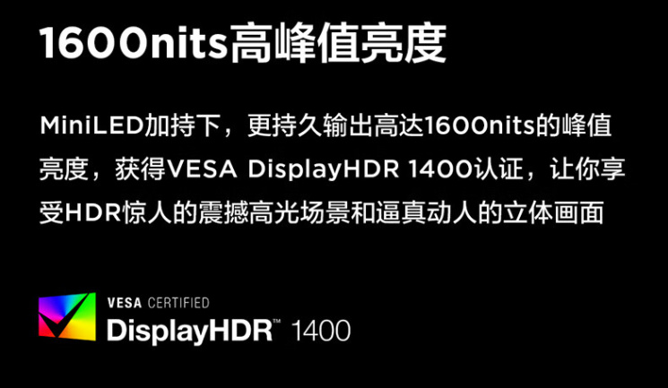 ▲而MiniLED背光技術的屏幕,峯值亮度可達1600nits甚至更高,因此,VESA認證目前提供了DisplayHDR 1400認證,更高的峯值亮度與對比度,使其在顯示HDR圖像時畫面效果更加驚豔,同時MiniLED背光顯示器無需擔心OLED屏幕莫須有的燒屏。