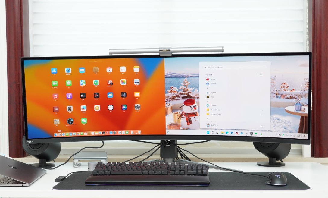 ▲比如部分項目,需要同時考慮在MacOS與Windows下的顯示效果,此時,開啓微星MPG 491CQP QD-OLED的並排畫面功能,便可將其分爲兩個屏幕,顯示不同視頻源的內容。這裏除了可以將帶魚王屏幕分割爲2塊16:9的標準寬屏之外,還可以分割成一塊21:9的帶魚屏與一塊11:9的類方屏,或者自定義兩塊屏幕的比例,畫面比例適應性十分強。