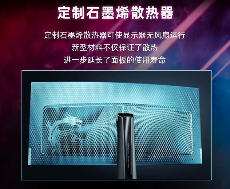 ▲談到OLED屏幕,肯定有朋友要說燒屏,燒屏情況現在越來越少了,而微星則爲MPG 491CQP QD-OLED顯示器提供了定製的石墨烯散熱器,確保OLED顯示器也可以無風扇運行,配合OSC菜單中的面板保護功能,能夠有效延長OLED屏幕的壽命。