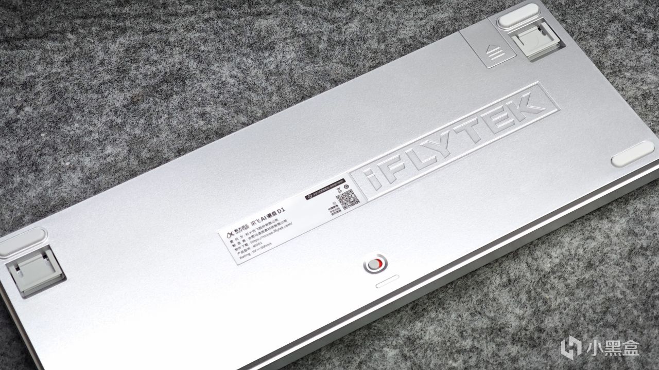 背面则是和边框一样的金属质感,中间还是熟悉的信息贴纸,旁边是科大讯飞的英文名,采用阴刻的处理方式,质感上表现非常不错。在下方就是键盘的电源开关,键盘整体重量比较轻放在底面还是可以接受的。