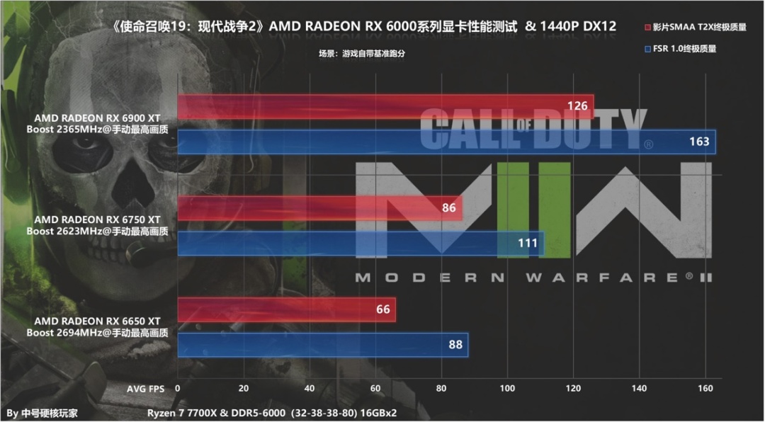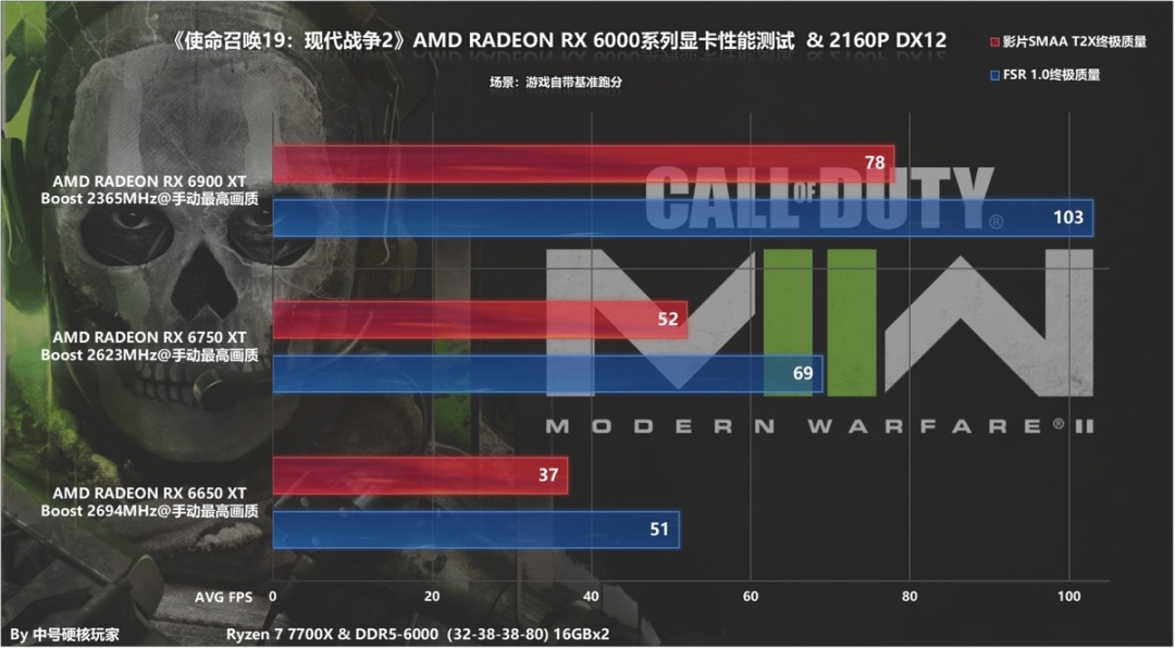 4K分辨率,RX 6650 XT使用FSR 1.0技術是能夠達到平均51幀,基本能夠滿足要求不是特別高的劇情黨,而對於其他或者戰區2.0模式,那麼至少使用RX 6750 XT纔可以玩得流暢,而滿足高刷新率+4K最高畫質這種極端條件,目前性價比較高的RX 6900 XT是個不錯的選擇,在4K下開啓FSR畫面並不會損失很多。