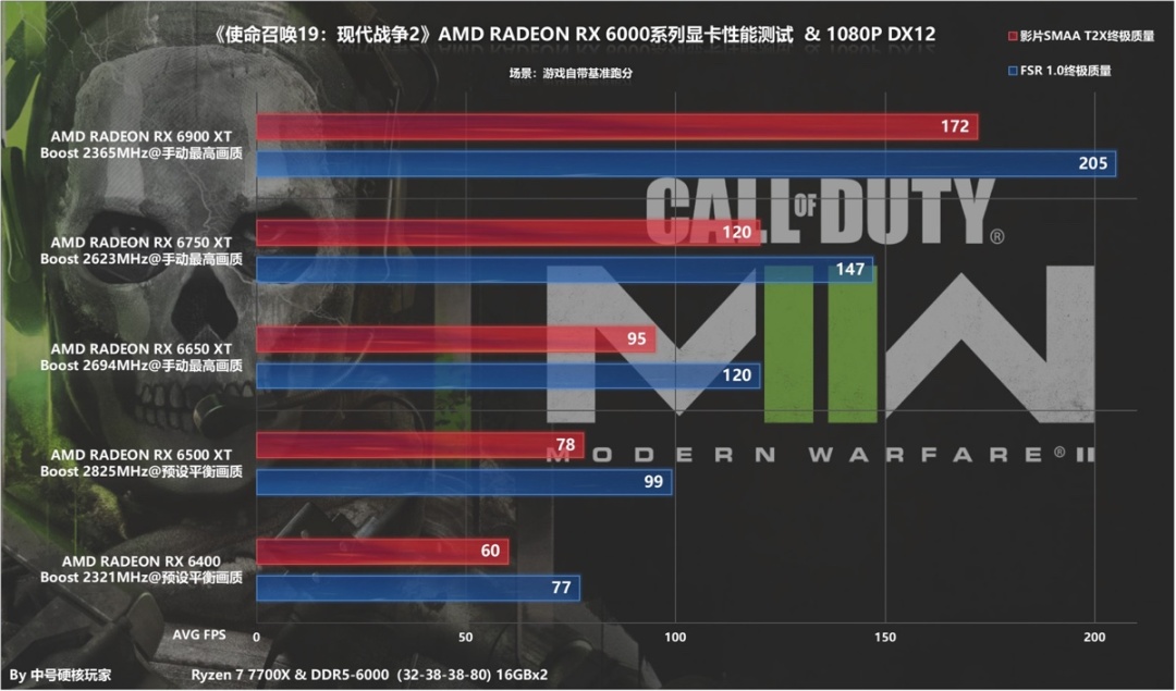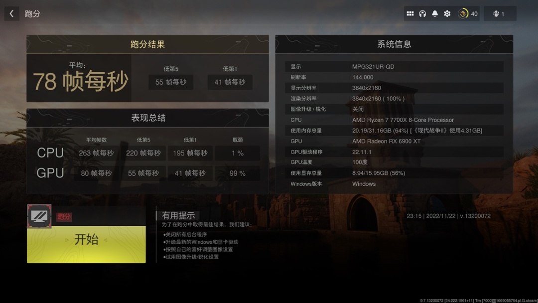 安裝的是Adrenalin 22.11.1 Optional (WHQL)顯卡驅動以及最新版本的芯片組驅動,該版本對《使命召喚:戰區 2.0》有針對優化(早前版本已覆蓋COD19優化配置),操作系統是Windows 11 22H2最新版本,Ryzen 7 7700X使用默認PBO AUTO狀態,搭配兩根DDR5 6000C32 16GBX2組成雙通道,並在BIOS中開啓SAM技術提升一些顯卡性能。