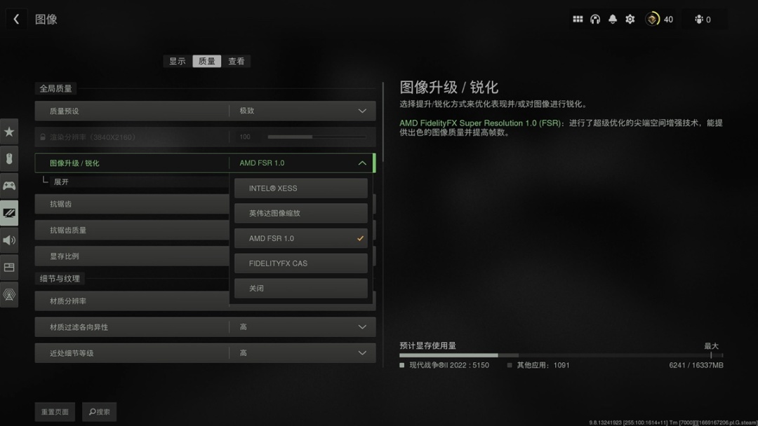 COD19抗鋸齒是使用默認的影片SMAA T2X,除此之外,遊戲還擁有多達6種圖像提升技術(比之前《漫威蜘蛛俠》PC版還多),它們分別是INTEL XESS、NVIDIA DLSS 2.4、NVIDIA DLAA、NVIDIA NIS、AMD FSR 1.0以及FIDELITYFX CAS,如此全面的福利選項對於玩家無疑是個天大好消息,下面就在使用A卡情況下,瞧瞧FSR 1.0具體畫面效果怎麼樣吧。