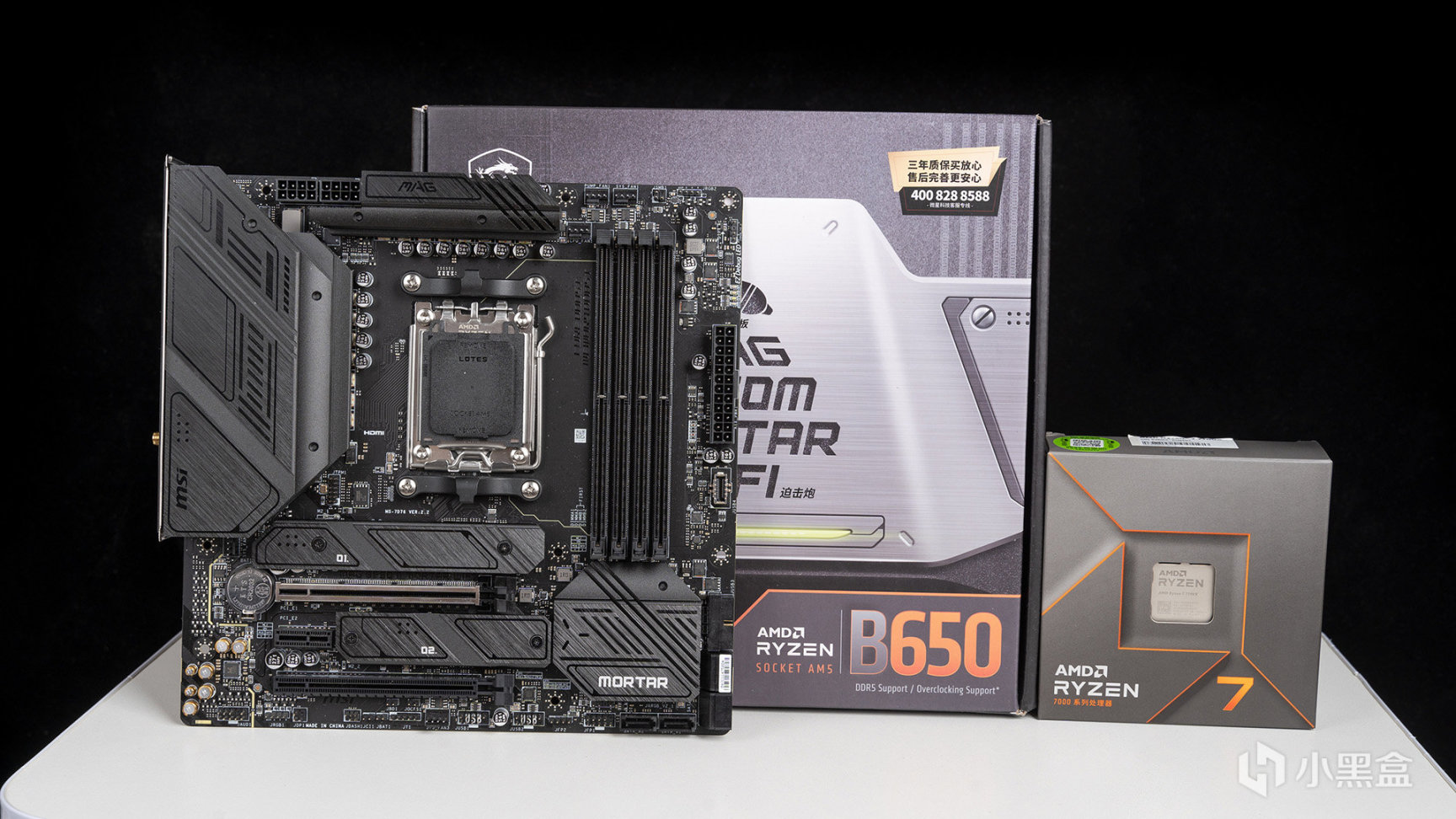 搭配Ryzen 7 7700X主板是微星MAG B650M MORTAR WIFI迫擊炮,主板採用12+1+2路豪華供電,其中CPU VCORE每相MOSFET可以達到80A,支持兩組M.2插槽可安裝PCIe 4.0固態,I/O接口比上一代也有相應升級,整體配置和規格來看,這款主板定位是比以往B系列更高一級的產品