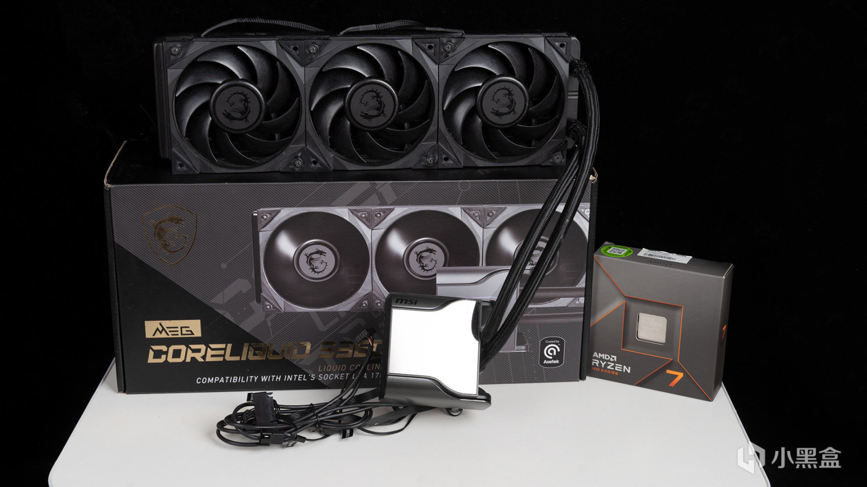 搭配CPU的水冷散熱器是微星MEG CORELIQUID S360,採用Asetek第七代水泵主流方案,擁有裝飾上蓋+2.4寸的IPS材質LCD顯示屏,在屏幕和水泵之間設計有一枚60mm嵌入式風扇,幾乎純黑配色,代表着追求高性能,輕鬆壓制旗艦級銳龍9 7950X處理器。