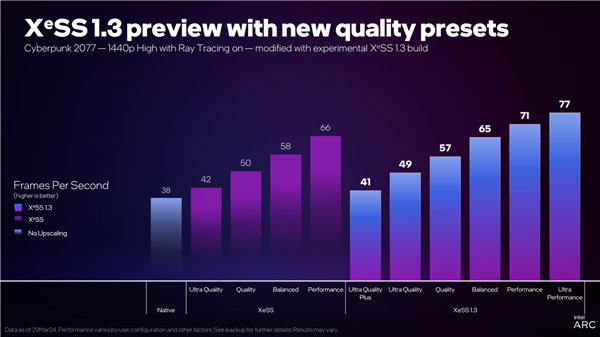 XeSS 1.3还全面升级了画质/性能预设,超高质量、质量、平衡、性能的缩放比例分别从1.3x、1.5x、1.7x、2.0x提高到了1.5x、1.7x、2.0x、2.3x。