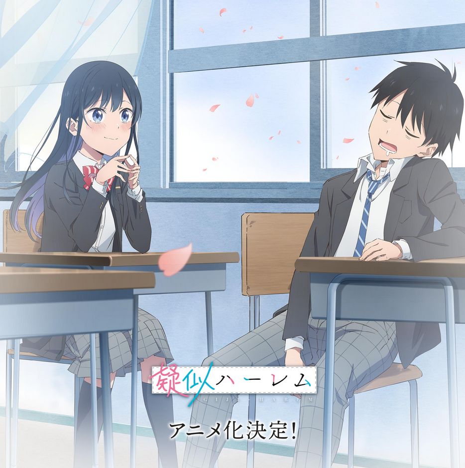 《疑似後宮》的劇情圍繞憧憬着後宮漫畫一般狀態的學長北濱瑛二,以及雖然暗戀男主但在學長面前就會忍不住扮演其他形象的七倉凜展開,同處戲劇社的兩人之間迸發出獨特火花。將由菊池聰延執導,柿原優子負責劇本統籌,佐藤義久男擔綱角色設計,主角北濱瑛二和七倉凜的聲優則是岡本信彥和早見沙織,動畫預計在7月正式播出。