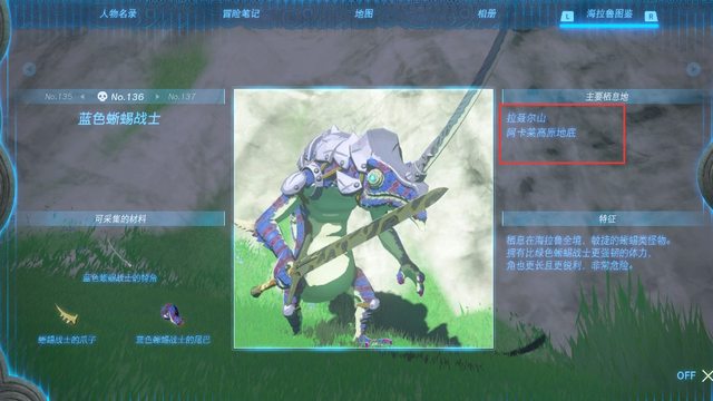 蓝色蜥蜴战士在拉聂尔山和阿卡莱高原地底,在这能找到他。蓝色蜥蜴战士是怪物之一,栖息在海拉鲁全境,敏捷的蜥蜴类怪物。拥有比绿色蜥蜴战士更强韧的体力,角也更长且更锐利,非常危险。