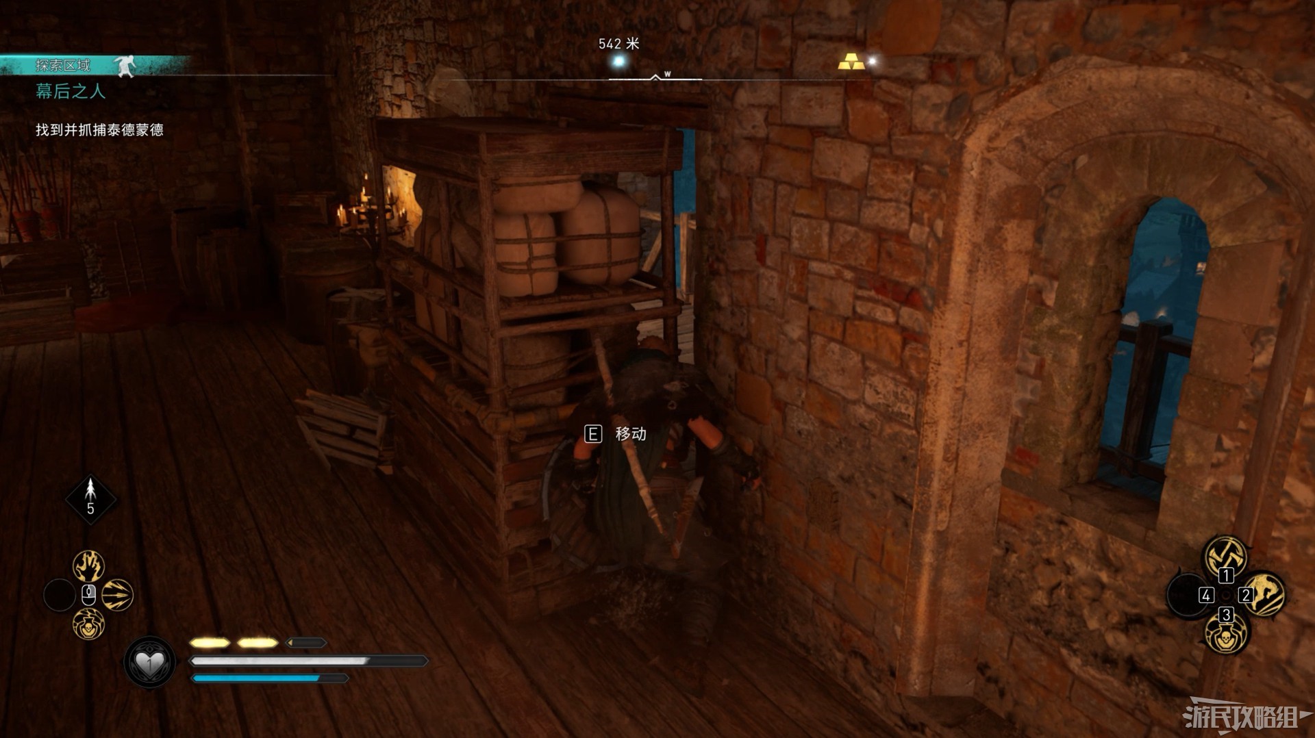 为了队伍能从河中到达鲁切斯特城堡,艾沃尔需要进入城堡破坏锁链。从任务提示的塔楼旁登上城墙,暗杀城墙拐角处的守卫。