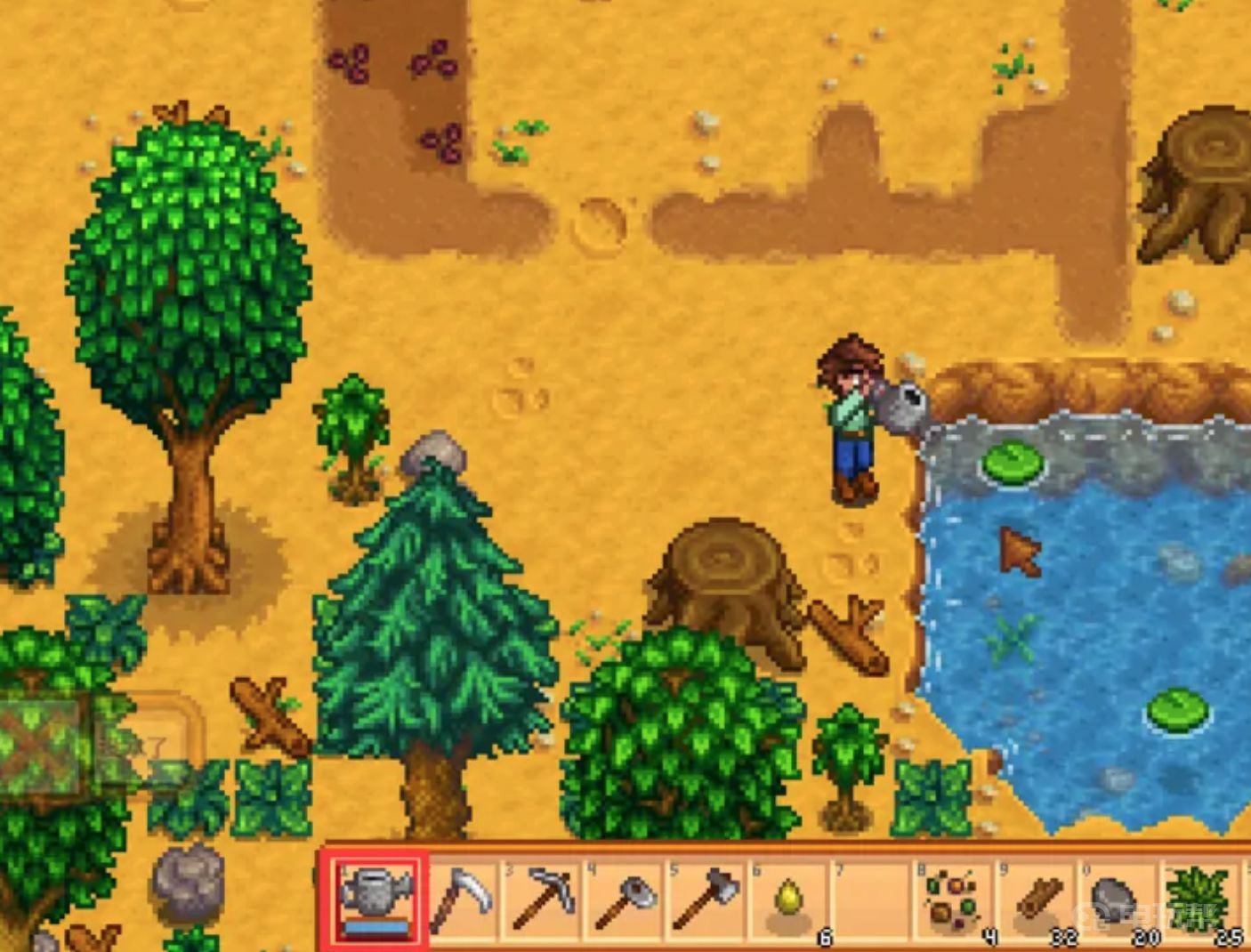 物品栏中的水壶下面是有个进度条的,当进度条为零时就表示水壶的水空了。地图上是有很多水源的,在自家院子里一般就是如图的这个池塘,只要有水的地方都可以灌满水壶。选中水壶然后然后点击水面,水壶就会自动装满水了。