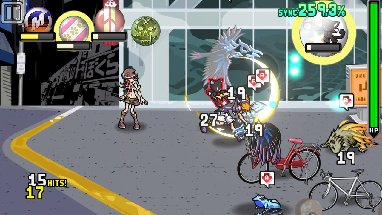 有些能力具有控场效果,如制造地震或是向愤怒的噪音们投掷汽车及广告牌。其它能力则相对简单,如通过连点来发射能量弹,或是划屏来让音操使出手刀攻击等。上分屏则是另一同伴,玩家则需要使用方向键来进行连击。战斗中,会出现在两个角色之间来回穿梭移动的能量球,获得能量球的一方将得到技能增强。传球次数越多,球的移动速度也会越快,相应地,你在战斗中也会越强力。除此之外,玩家还需要记住特定的组合,从而积攒「聚合之星 (fusion stars)」以释放必杀技。整个战斗过程中,你需要一直一心二用。
