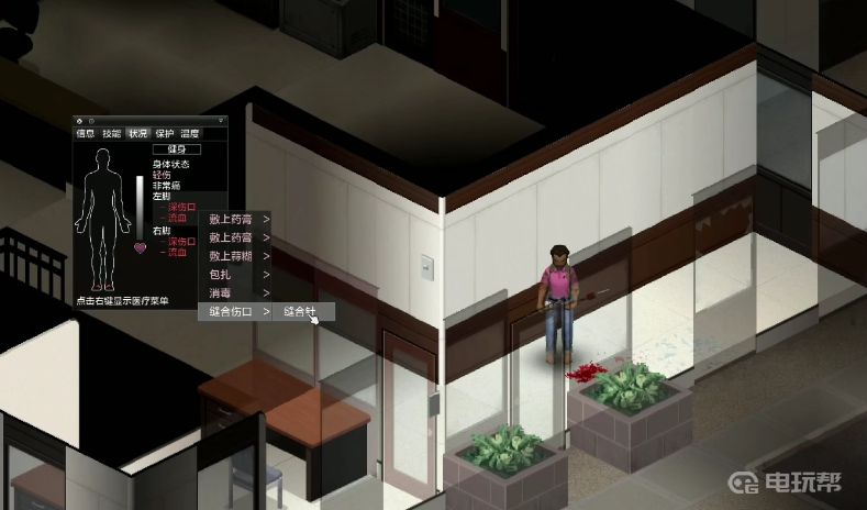 先包紮然後喫東西喫到飽,然後消毒縫合傷口,之後消毒包紮就行了,需要縫合針和縫合線,放在口袋裏就能用,如果傷口需要縫右鍵會出現一個選項,點這個縫合傷口就可以了