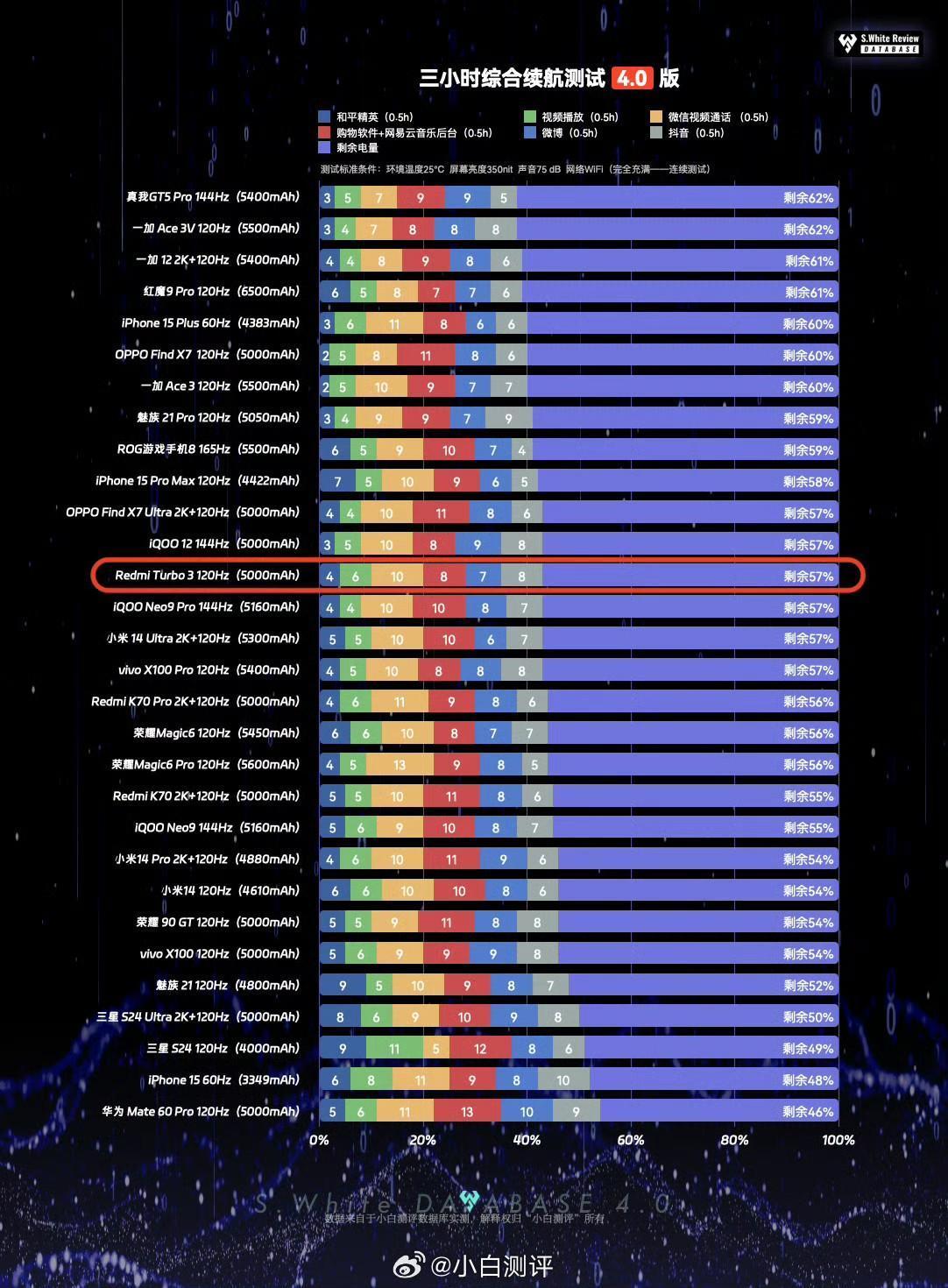 5500mAh的大容量電池提供了充足的使用時間,官方dou1.86天,即便是重度手機玩家也能輕鬆度過一整天。支持100W快充技術,26分鐘左右充滿,則大幅縮短了充電時間,讓手機在短時間內迅速恢復活力。一加ace3v在小白測評數據庫三小時綜合續航測試4.0版本排名第一。