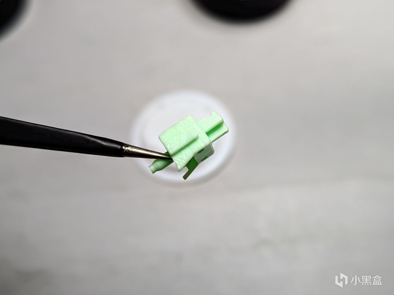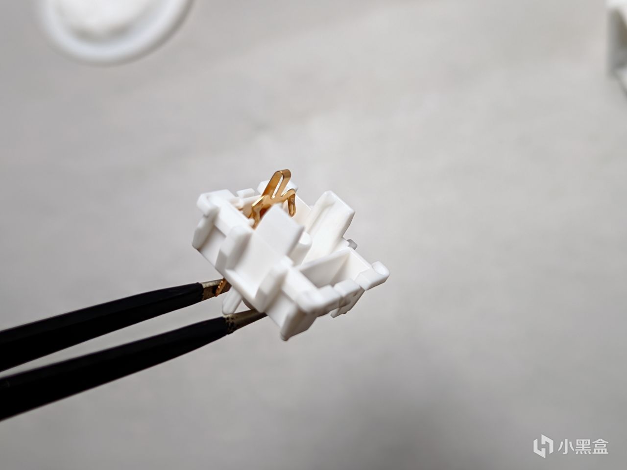 那聊完了茉莉軸,我們來看看美拉德軸吧,從圖上可以看到,這種大卡扣固定的軸體需要使用的是鐮刀型的開軸器,固定好後依然是按壓開軸,沒有什麼難度。