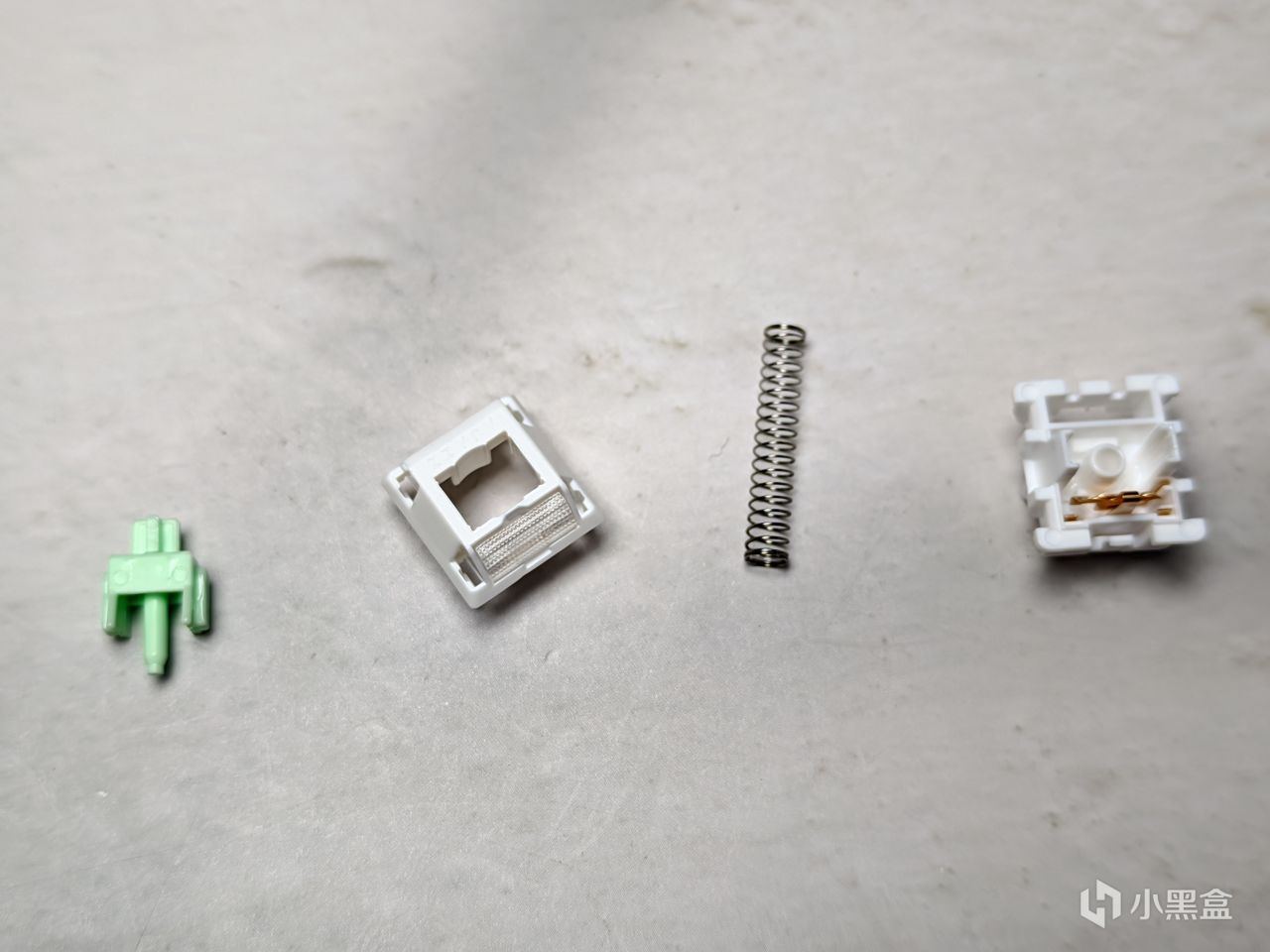拆開後你就會得到以上四件套:軸心,上蓋,彈簧以及底殼,高階玩家會把彈片也取出潤滑,但這部分對於小白來說過難了,稍微不注意彈片彎折軸體基本就算是報廢了,而其帶來的提升又不算大,所以這邊並沒有彈片潤滑的部分。