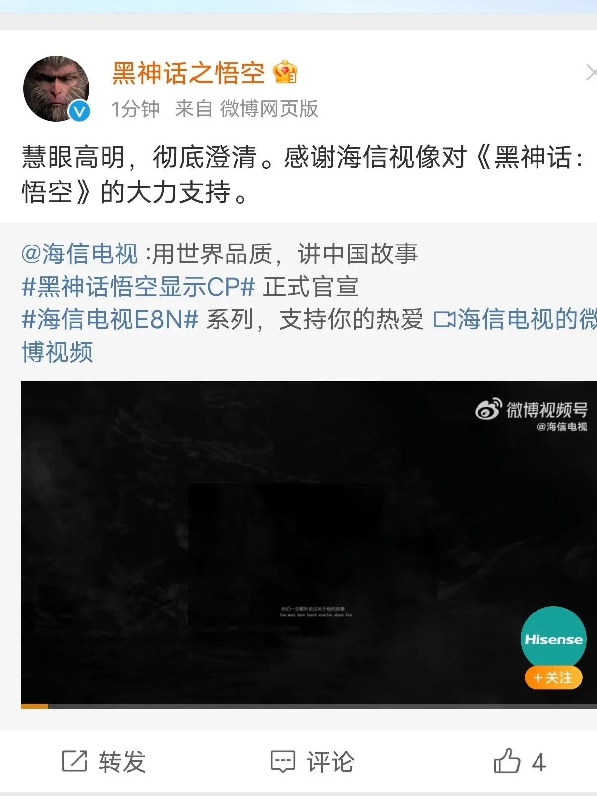 黑神話官方也發文感謝海信宣傳支持