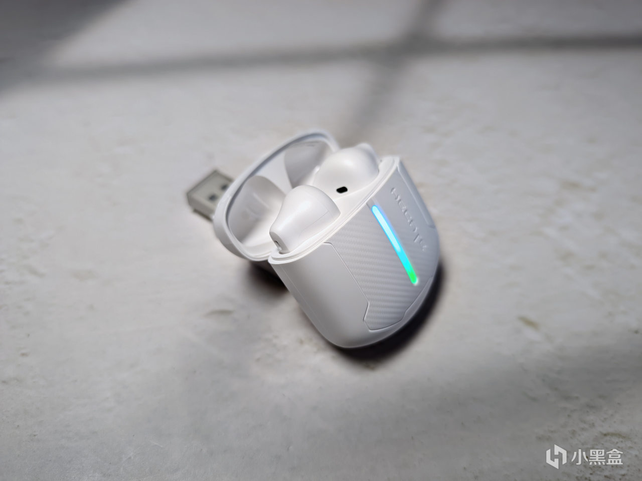 打開包裝就可以看到耳機充電倉以及接收器了,我這邊選擇的是一個藍白色的耳機,顏色比較素雅,看着比較舒服,不過其還有更具電競氣息的黑紅配色以及紫羅蘭色,有興趣的可以自行去看一下。
