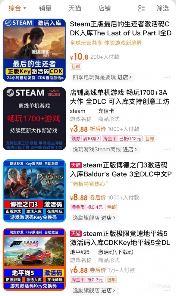 畢竟就像我前面說的那樣,正常情況下你想要上當其實是很難的。因爲你直接在淘寶搜索對應的遊戲名字,彈出來的必然是隻比steam商城標價低幾十塊的正版CDK。