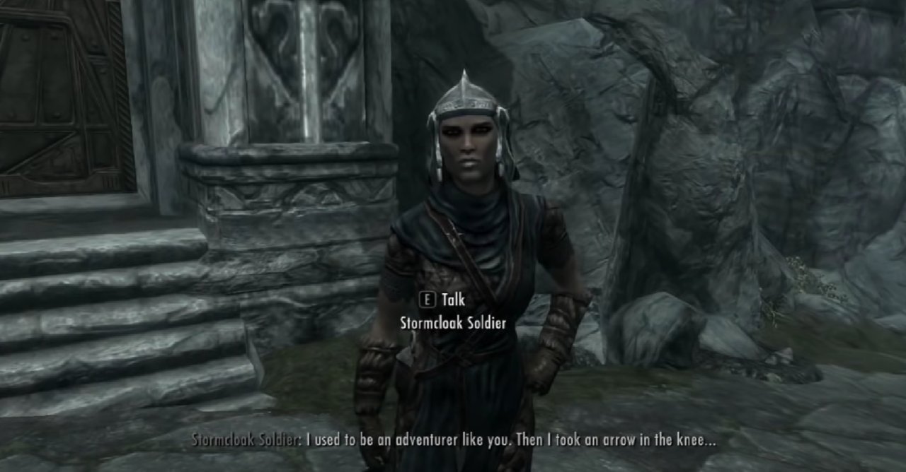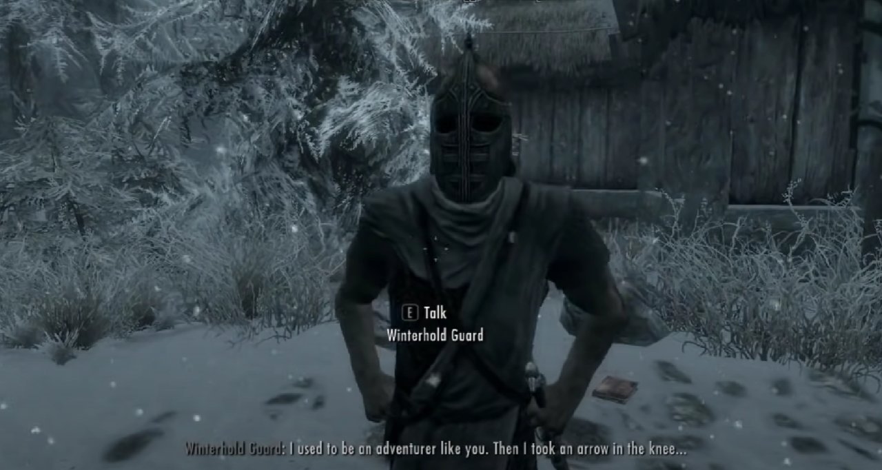 在《上古卷軸5:天際》之中衛兵的標準臺詞,也是NPC對話出現頻率最高的一句在遊戲中"I used to be an adventurer like you, then I took an arrow in the knee."