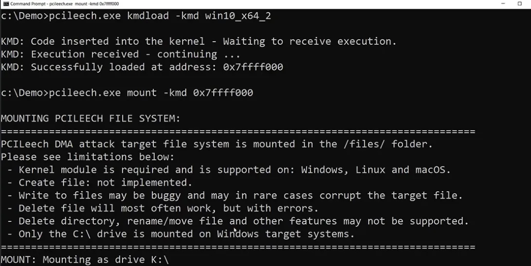 由於在DMA和CPU同時進行內存訪問的情況下,DMA的優先級會更高,利用這個特定,就可以使用FPGA模擬DMA請求來進行內存訪問,在windows系統上掛載內存到本地的K盤