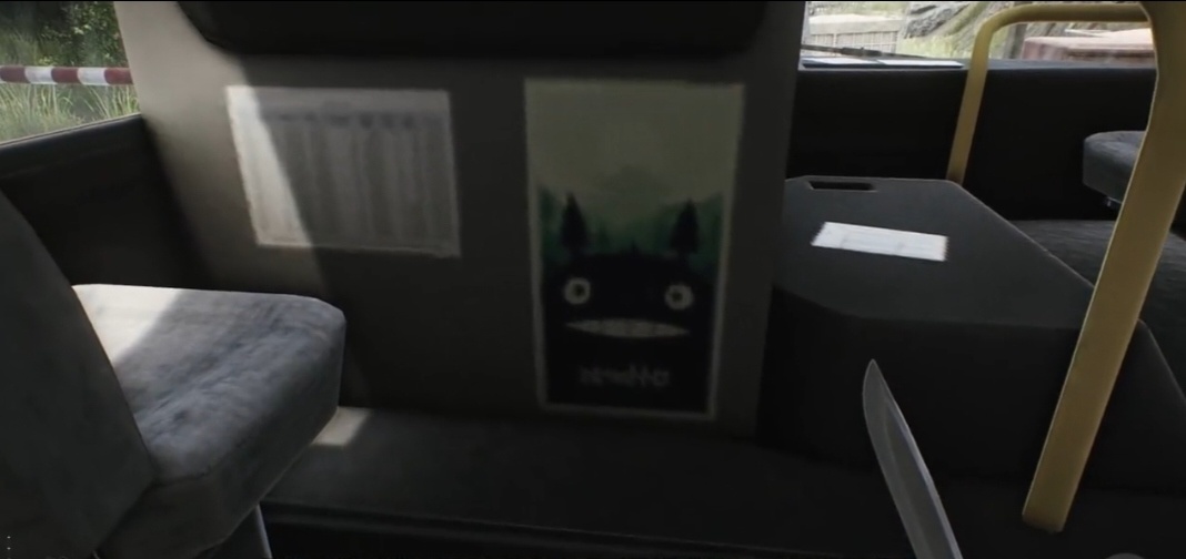 在海岸線的塔樓路障旁有一輛黃色公交車,我們上車以後呢,就會看到一個小壁畫,這是塔科夫致敬龍貓的小彩蛋。