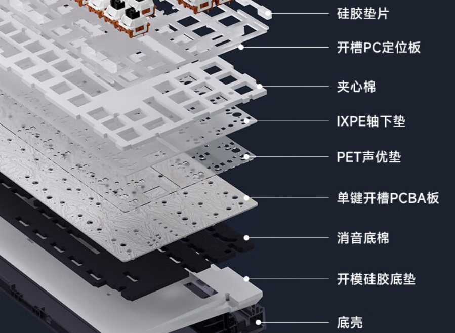 這把鍵盤使用的是板簧GASKET結構和五層消音即PO消音棉+IXPE軸下墊+pet墊片+硅膠+底棉,下蓋的硅膠墊也可以很好的減少打字空腔音。另外鍵盤帶的是4000毫安大電池,無論是辦公黨還是遊戲黨都可以做到超長續航,減少多次充電的煩惱。