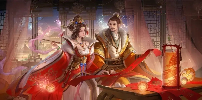 與孫尚香卿卿我我完了之後,劉備又來和吳莧花前月下了。又是一年春節,夫妻二人一起寫春聯。在龍燈溫和的火光下,劉備將對聯攤開,吳莧揮墨寫就。兩人對視一眼,情意綿綿,心靈在此刻相通。