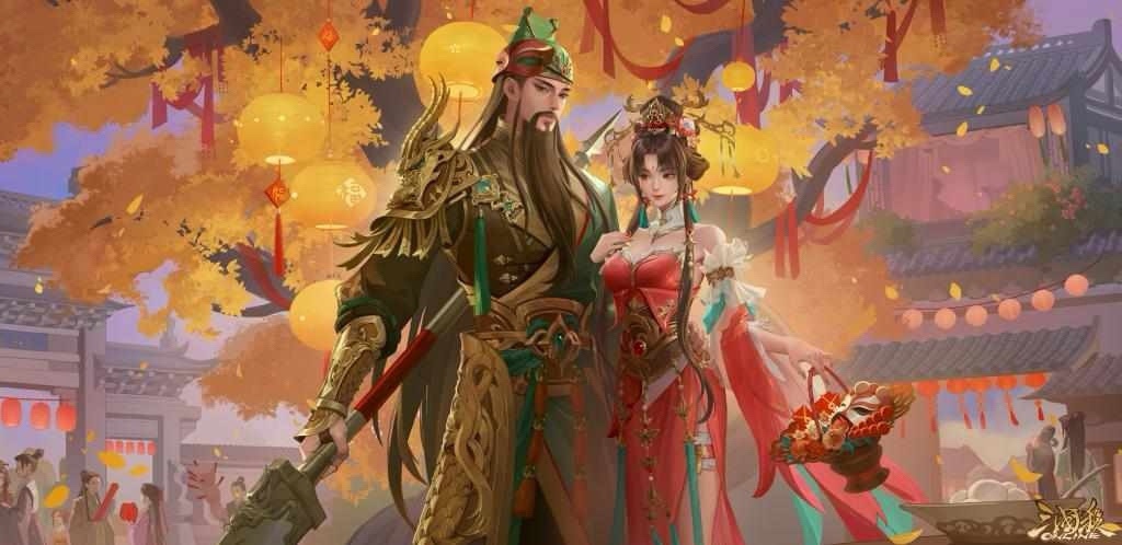 年關將近,大街各處張燈結綵,火樹銀花。關羽身穿戰甲,橫刀背後,胡金定紅袖飄香,手持花籃,兩人輕輕依偎在一起。背後掛滿了紅色絲帶的相思樹上金黃的燈籠隨風輕揚。