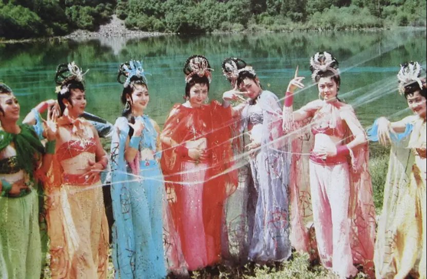 然後很有趣的是,當年飾演蜘蛛精的七位女演員也不同意拍攝原著裏這段洗澡和肚臍眼噴絲“露骨”鏡頭,於是楊潔導演想出兩計: