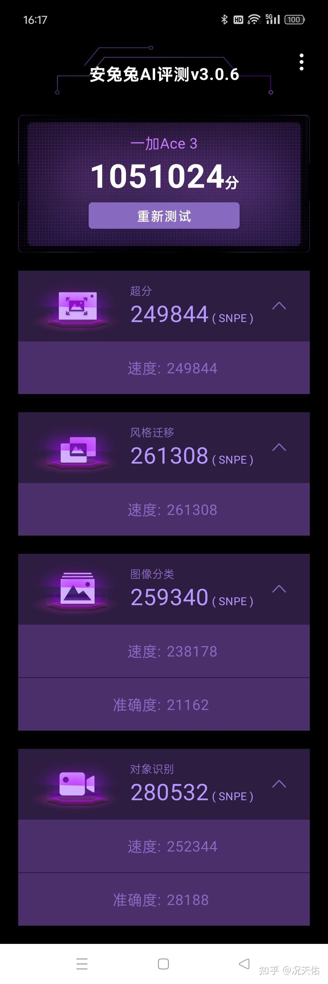 在安兔兔AI評測中,一加ACE 3在人工智能領域表現非常的不錯,總得分高達1051024分,充分展現了其卓越的人工智能性能。具體來看在超分項目中,一加ACE 3獲得了249844分,體現了其在圖像增強和細節恢復方面的強大能力。在風格遷移測試中,一加ACE 3取得了261308分的高分,展示了其獨特且創新的圖像處理技術。在圖像分類項目中,一加ACE 3以259340分的成績,再次證明了其出色的圖像識別能力。最後,在對象識別測試中,一加ACE 3的得分高達280532分,凸顯了其在複雜場景中的精準識別能力。總的來說一加ACE 3在人工智能領域還是非常可打的。