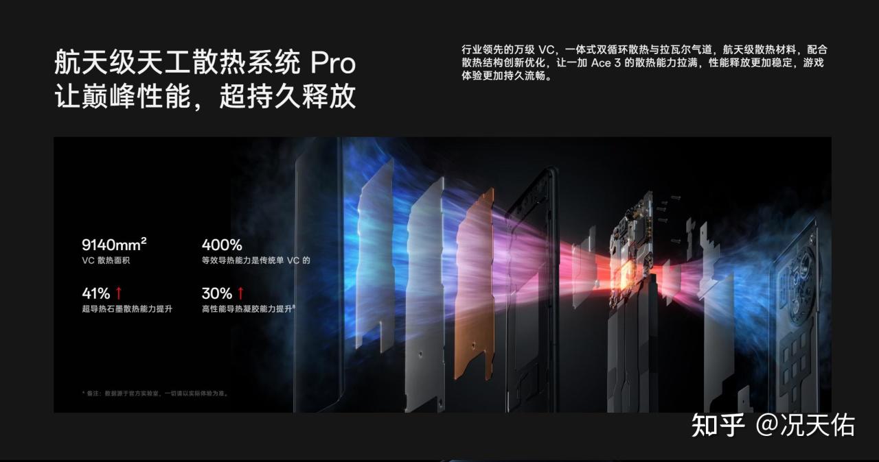 一加ACE 3還擁有非常出色的散熱系統,它承襲了一加 12的“天工散熱系統Pro”,通過大幅優化VC和機身內部散熱結構,以及增加新一代超導熱石墨,顯著提升了散熱體驗。散熱面積達到了9140mm²的超大VC,整機散熱總面積高達38547mm²,是當前智能手機中設計最先進、工藝最複雜、導熱性能最好的散熱系統。一加ACE 3同樣採用了行業最先進的航天級新一代超導熱材料,熱導率比常規材料提升了41%和30%,是目前行業導熱性能最強的材料,大大提高了散熱效率。此外,一加ACE 3還藉助全球首創的“一體式雙循環散熱系統”與“拉瓦爾氣道”空間設計,實現了行業常規平面散熱的突破,將散熱效果提升到一個全新的水平。一加ACE 3的散熱設計不僅顯著改善了長時間遊戲、看視頻等重負載場景的溫度表現,還引領行業進入了由散熱面積、散熱材料、空間結構組成的三維散熱時代。