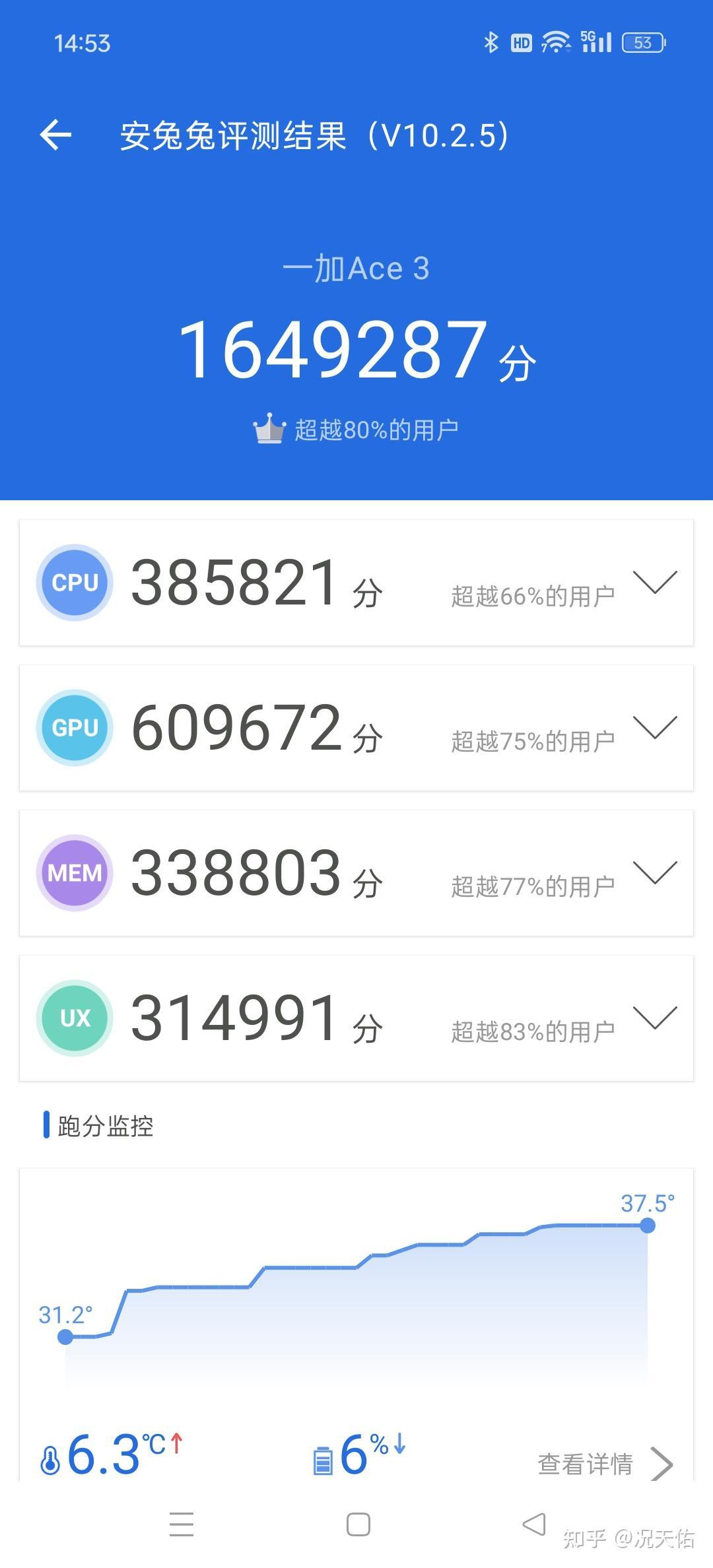 我的這款一加ACE 3 16GB+1TB 月海藍版本在安兔兔跑分中取得了相當不錯的成績,總得分爲1649287分,這一成績超越了目前80%的手機。具體到各項子項分數,一加ACE 3的CPU得分385821分,GPU得分609672分,MEM得分338803分,UX得分314991分,出色的硬件配置性能表現相當出色,一加ACE 3還搭載了“航天級天工散熱系統 Pro”,這一散熱系統確保了手機在長時間高強度使用過程中能夠保持穩定的性能表現,避免了因過熱而導致性能下降的問題,出色的散熱表現,無疑爲一加ACE 3的整體性能加分不少。